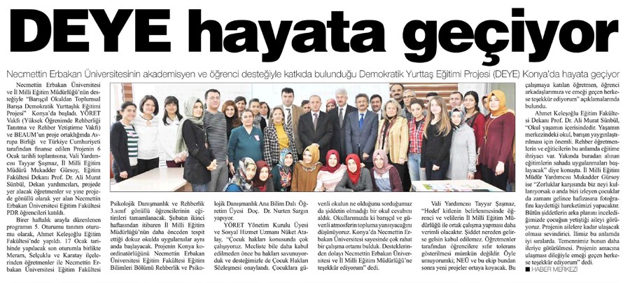Demokratik Yurttaş Eğitimleri (DEYE), merkezimiz ve YORET tarafından 2014-2015 eğitim döneminde hayata geçirilen, altı üniversiteden Psikolojik danışma öğrencilerinin barış eğiticiliği eğitimi aldıkları ve sonrasında bunu Türkiye’nin dört bir yanındaki ilköğretim okullarında pratik etme şansına sahip olabildikleri bir etkinliktir. Avrupa Birliği ve Türkiye Cumhuriyeti tarafından fonlanmıştır.